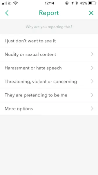 Discover-Live-Storys können auch wegen unangemessenen Inhalts gekennzeichnet werden. Wählen Sie einfach die Flagge unten links in der Story aus und Sie erhalten diesen Bildschirm.