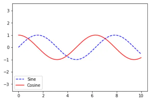 import> numpy as np> import> matplotlib.pyplot as plt> x>=> np.linspace(>0>,>10>,>1000>)> fig, ax>=> plt.subplots()> ax.plot(x, np.sin(x),>'--b'>, label>=>'Sine'>)> ax.plot(x, np.cos(x), c>=>'r'>, label>=>'Cosine'>)> ax.axis(>'equal'>)> leg>=> ax.legend(loc>=>'lower left'>)> |
